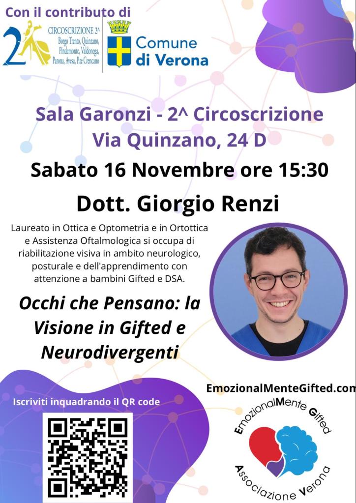 Conferenza con il dott. Giorgio Renzi: “Occhi che Pensano: la Visione in Gifted e Neurodivergenti” è un incontro dedicato alla visione e all’apprendimento nei bambini gifted e neurodivergenti di cui ci parlerà il Dott. Giorgio Renzi, laureato in Ottica e Optometria e in Ortottica e Assistenza Oftalmologica, con esperienza nella riabilitazione visiva in ambito neurologico, posturale e dell’apprendimento.